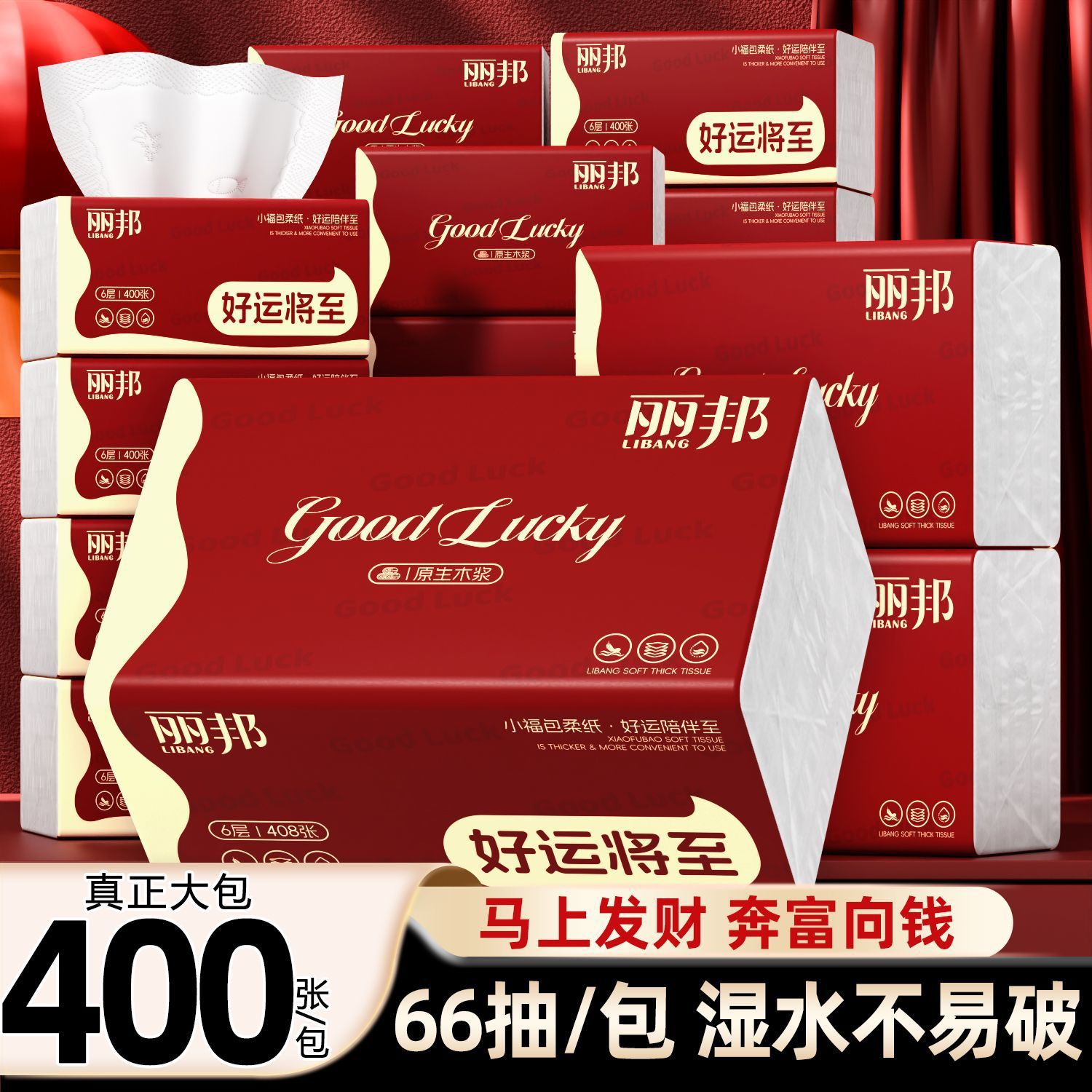 丽邦抽纸400张大包原木餐巾纸批发擦手纸新年红色面巾纸家用整箱