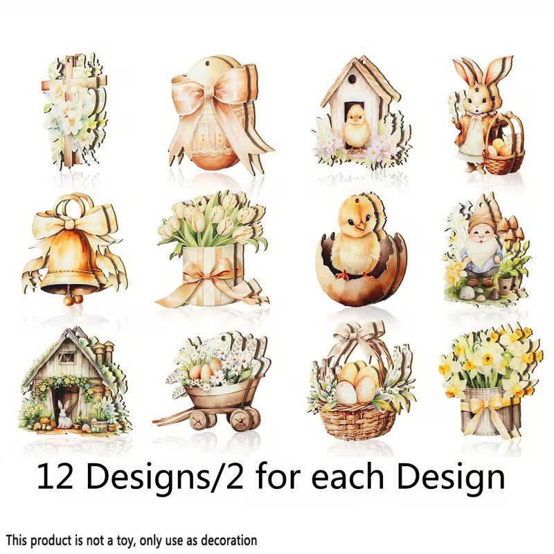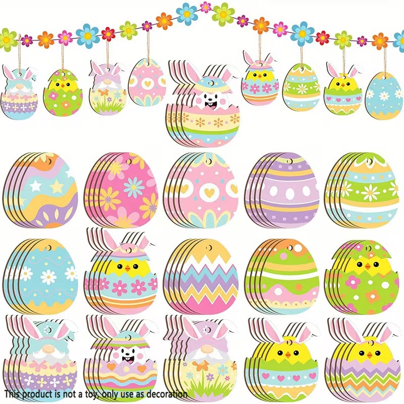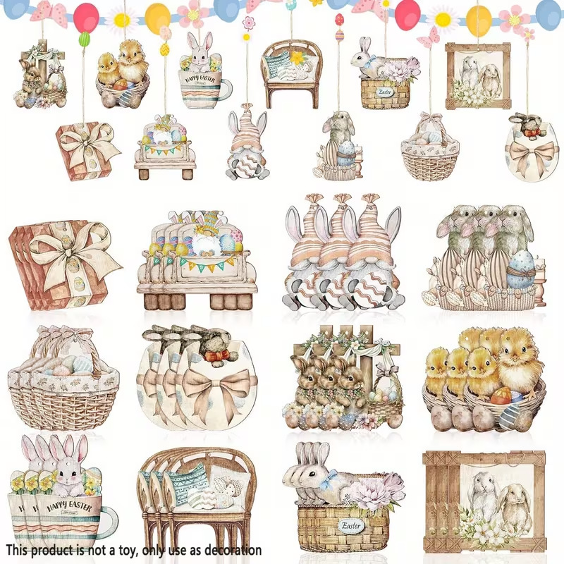 24件复活节木制装饰挂件装饰 彩色鸡蛋饰品木制花朵可爱兔子小鸡