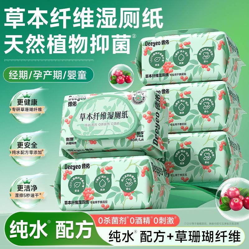 德佑纯水湿厕纸草珊瑚80抽大包家庭装抑菌加大加厚柔软亲肤可冲散