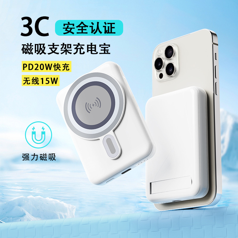 跨境新款磁吸无线充带支架小型便携5000毫安快充自带线移动电源