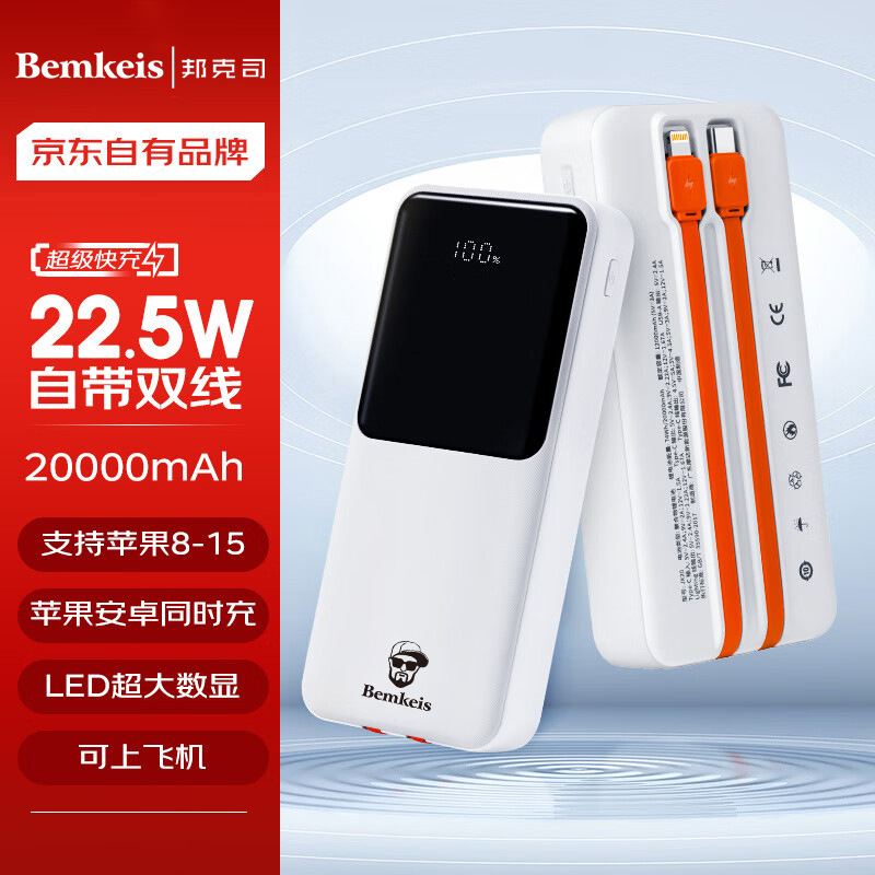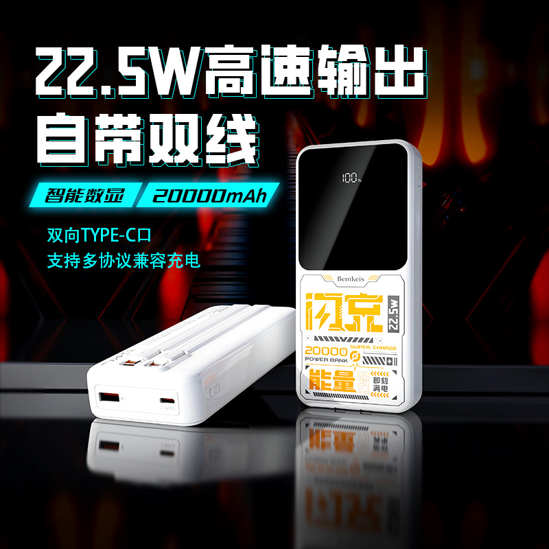 自带线充电宝20000毫安22.5W快充PD20W移动电源手机快充可贴LOGO