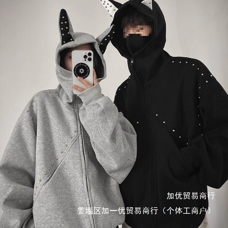 美式杜宾犬铆钉纯棉连帽衫卫衣女秋季新款宽松复古设计感外套2