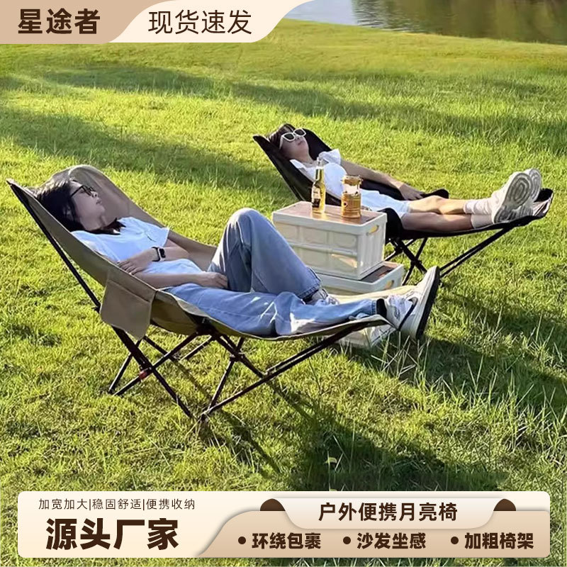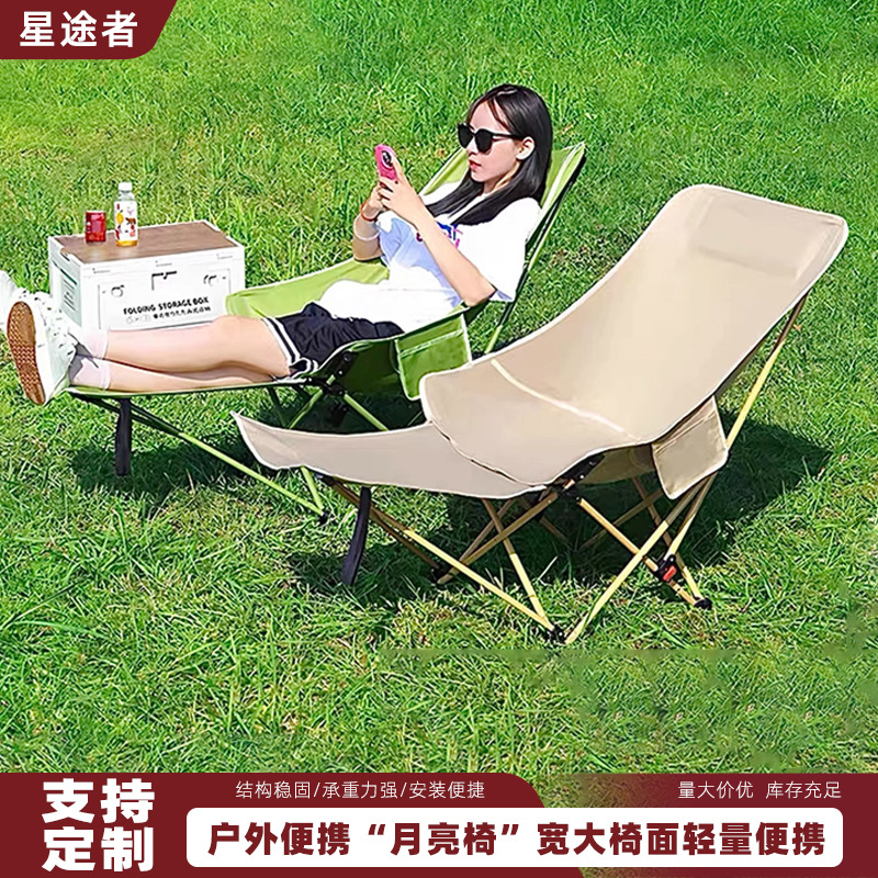 户外带脚托折叠椅厂家供应野餐休闲靠背椅露营写生可折叠月亮椅子