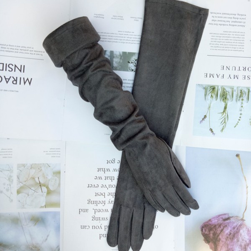 女鹿皮长款手套秋冬保暖加绒加厚韩版修手麂皮绒触屏过肘防颜