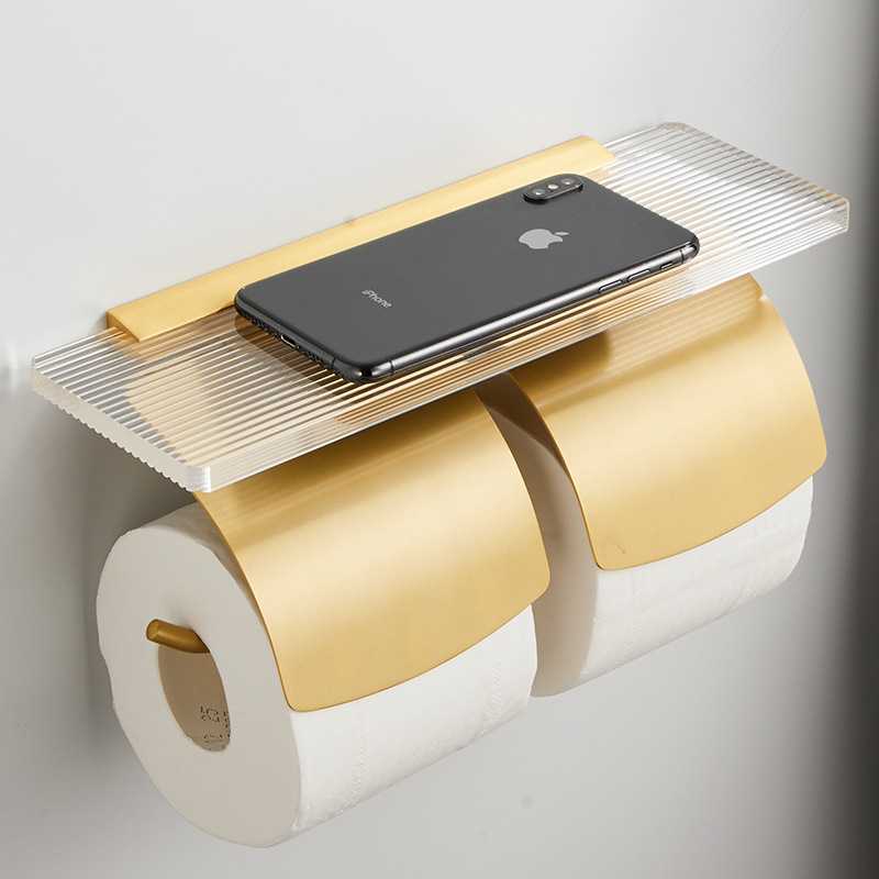 全铜双纸巾架卷纸架卫生间手机置物架银色厕纸架纸巾盒打孔纸巾钩