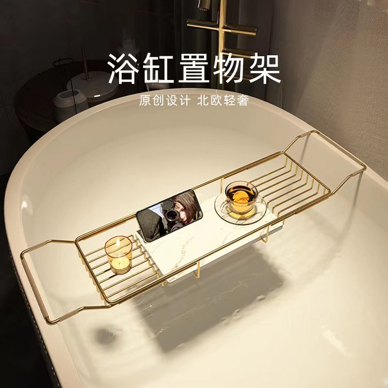 轻奢浴室伸缩手机置物架托盘多功能浴缸架洗澡盆大理石收纳神器架