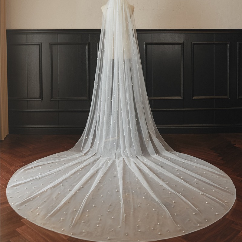新款3米门幅拖尾新娘瑞士软网金属发梳2025闪光珍珠红菱新娘头纱