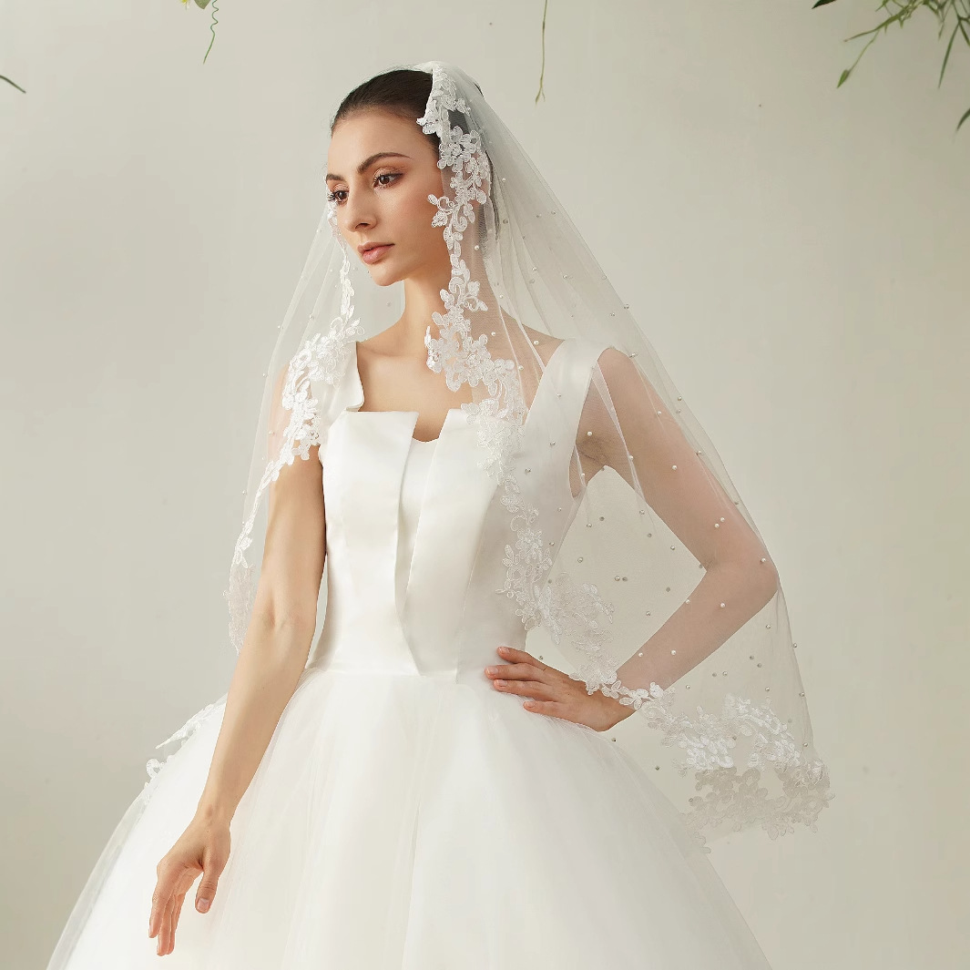 新款X68一层金属发梳排花新娘头纱珍珠装饰蕾丝花边红菱婚纱配件