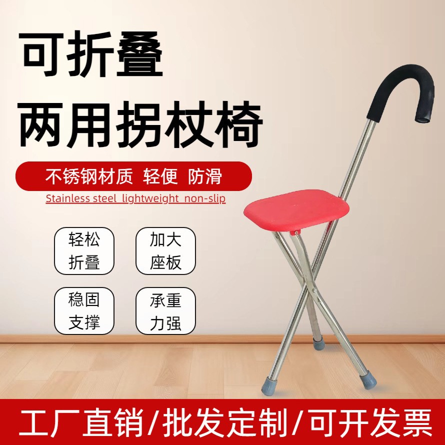 老人拐杖凳防滑防摔不锈钢拐杖凳四脚拐杖椅可折叠便携行走登山杖