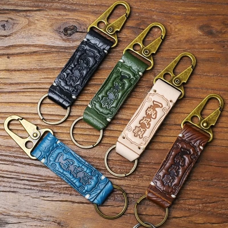 欧美复古风汽车钥匙扣压花纹牛皮汽车钥匙平安汽车钥匙扣挂件