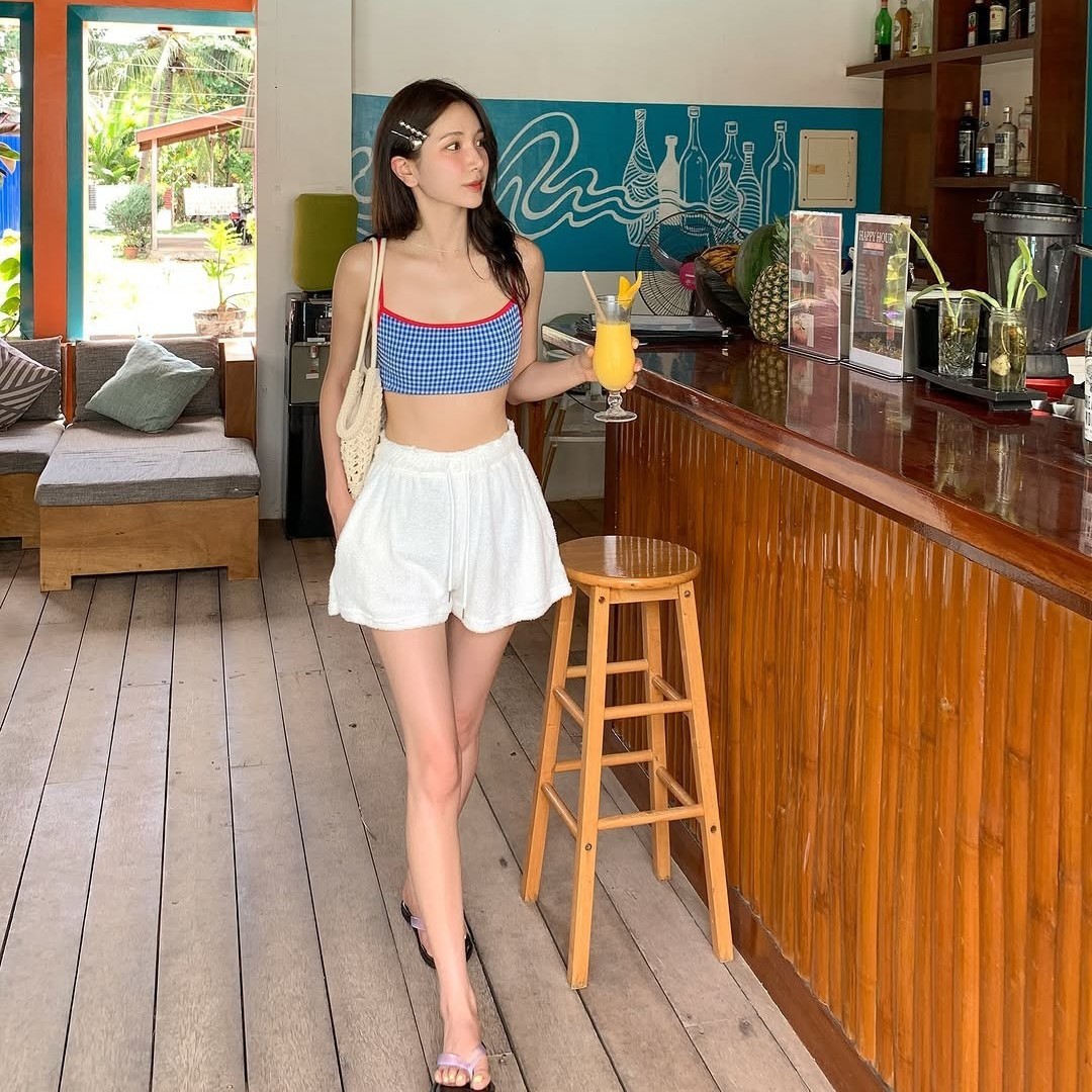 2025新款保守抹胸聚拢运动短裤条纹高腰显瘦小清新少女分体游泳衣