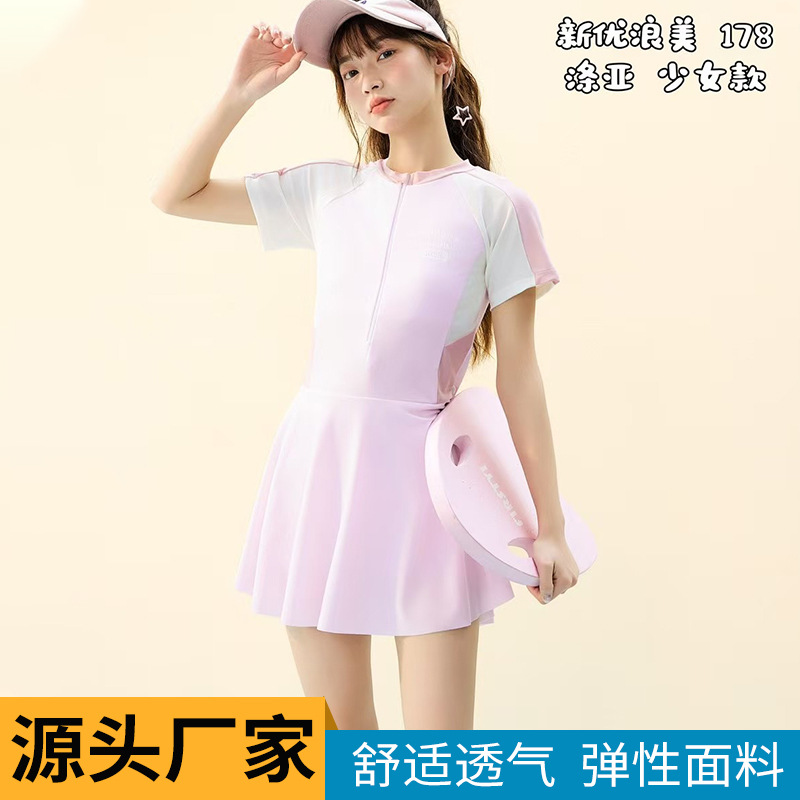 2025新款爆款儿童泳衣女大童拼色运动保守连体裙式韩系少女泳装