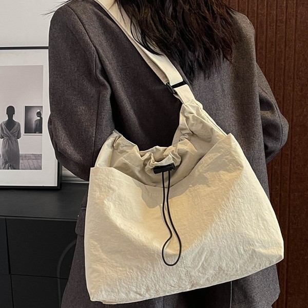 女式大容量拉链抽绳托特包防水尼龙布褶皱单肩包休闲百搭斜挎包包