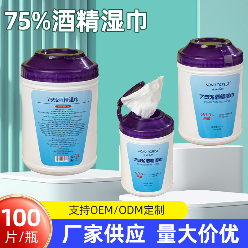 诺诺森林75酒精湿巾消毒杀菌厂家批发日用清洁100片罐装桶装定制