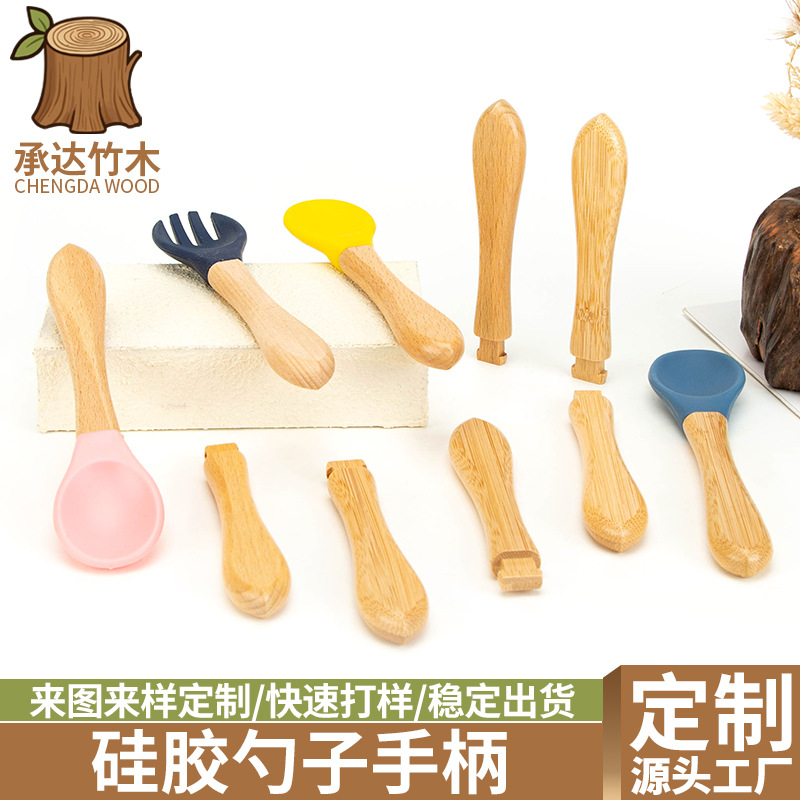 婴儿辅食勺子硅胶竹木手柄婴儿食品级材质匙羹硅胶叉子实木手柄