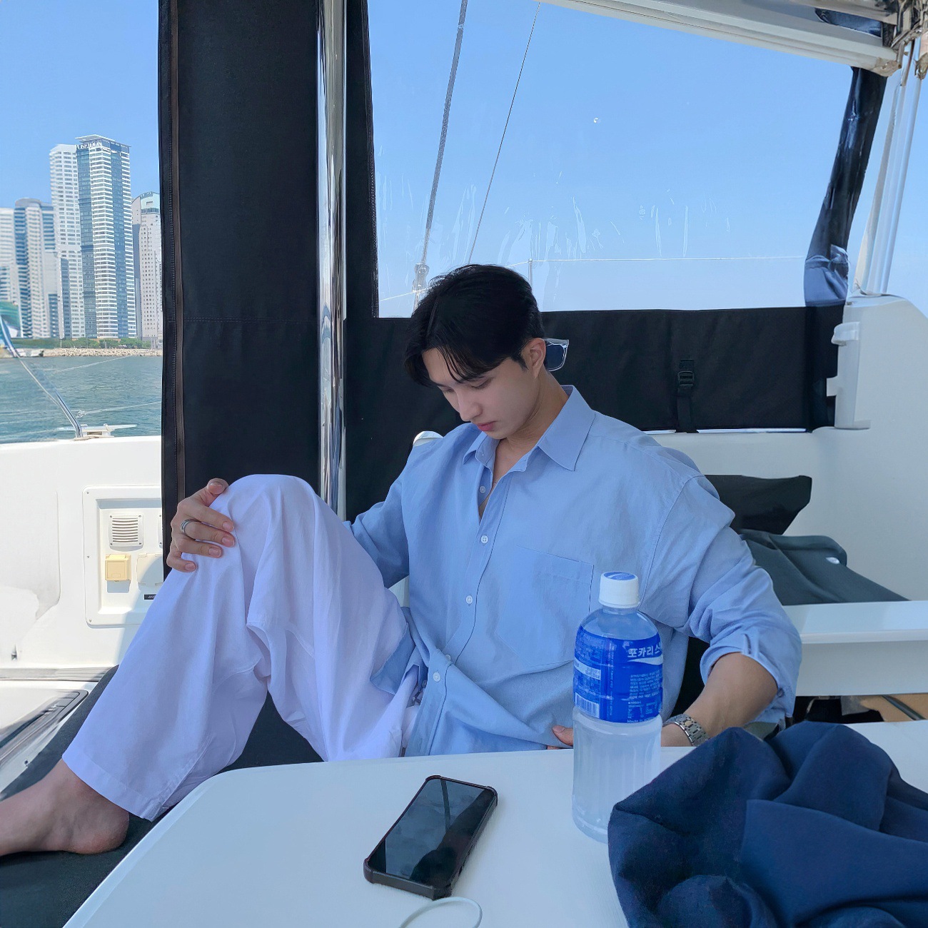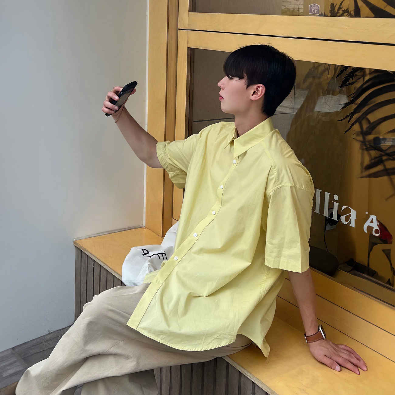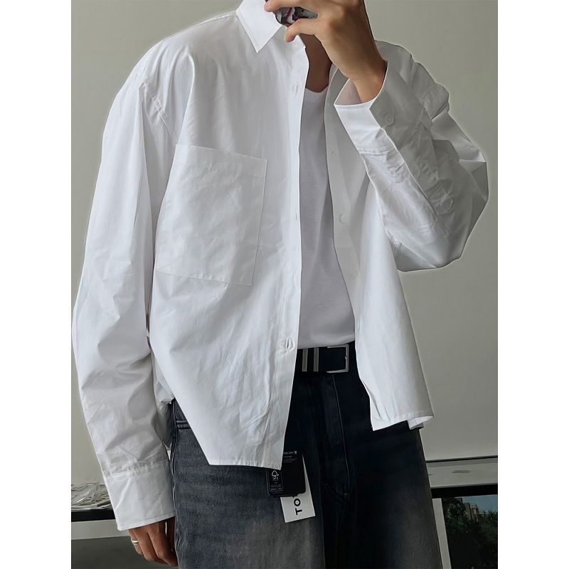 白色轻熟风短款衬衫男春季时尚chic极简风寸衫单口袋设计长袖衬衣