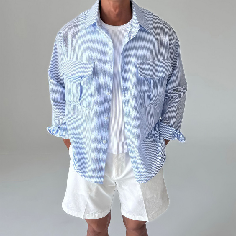 蓝色条纹长袖衬衫男士春季2026新款韩系宽松休闲翻领衬衣防晒外套