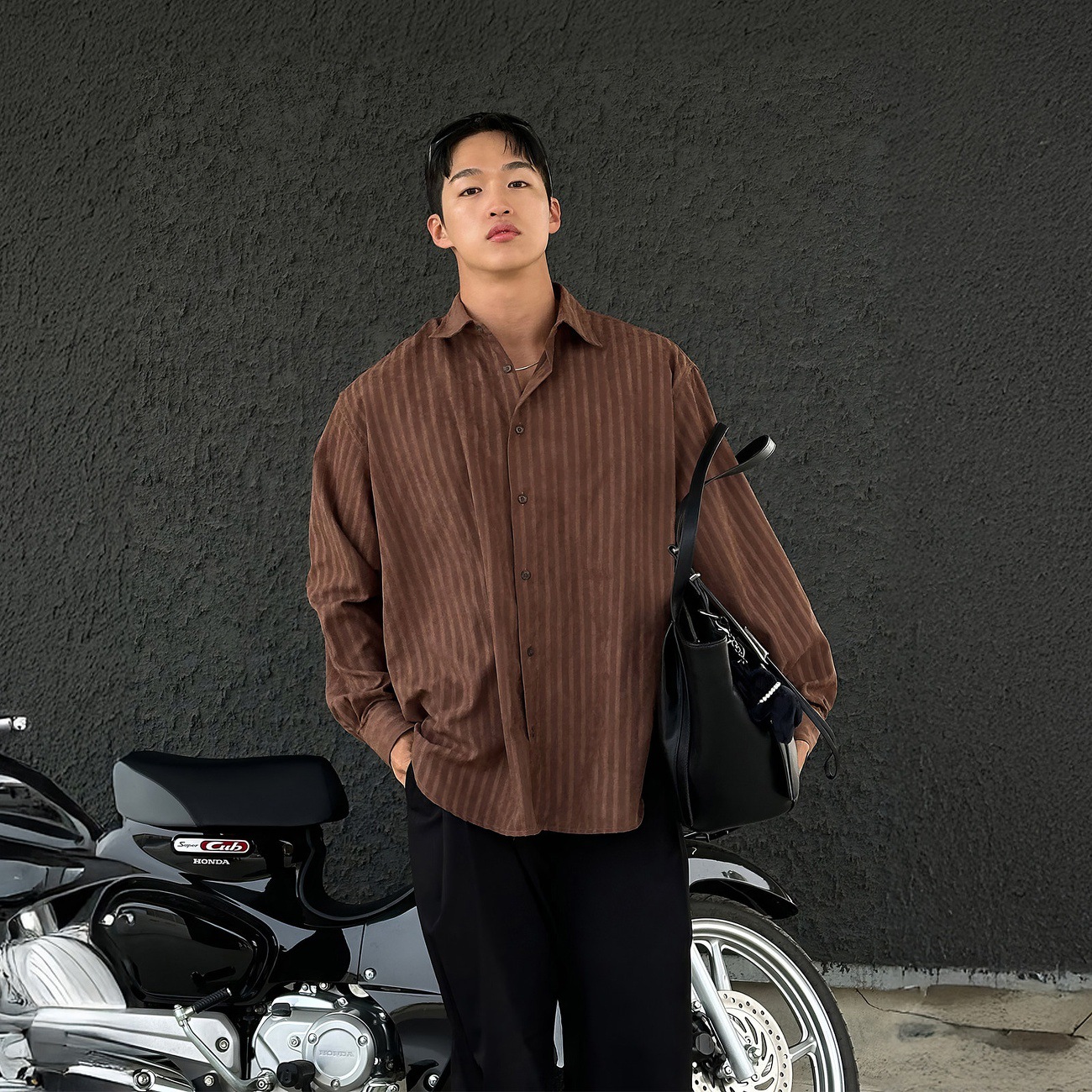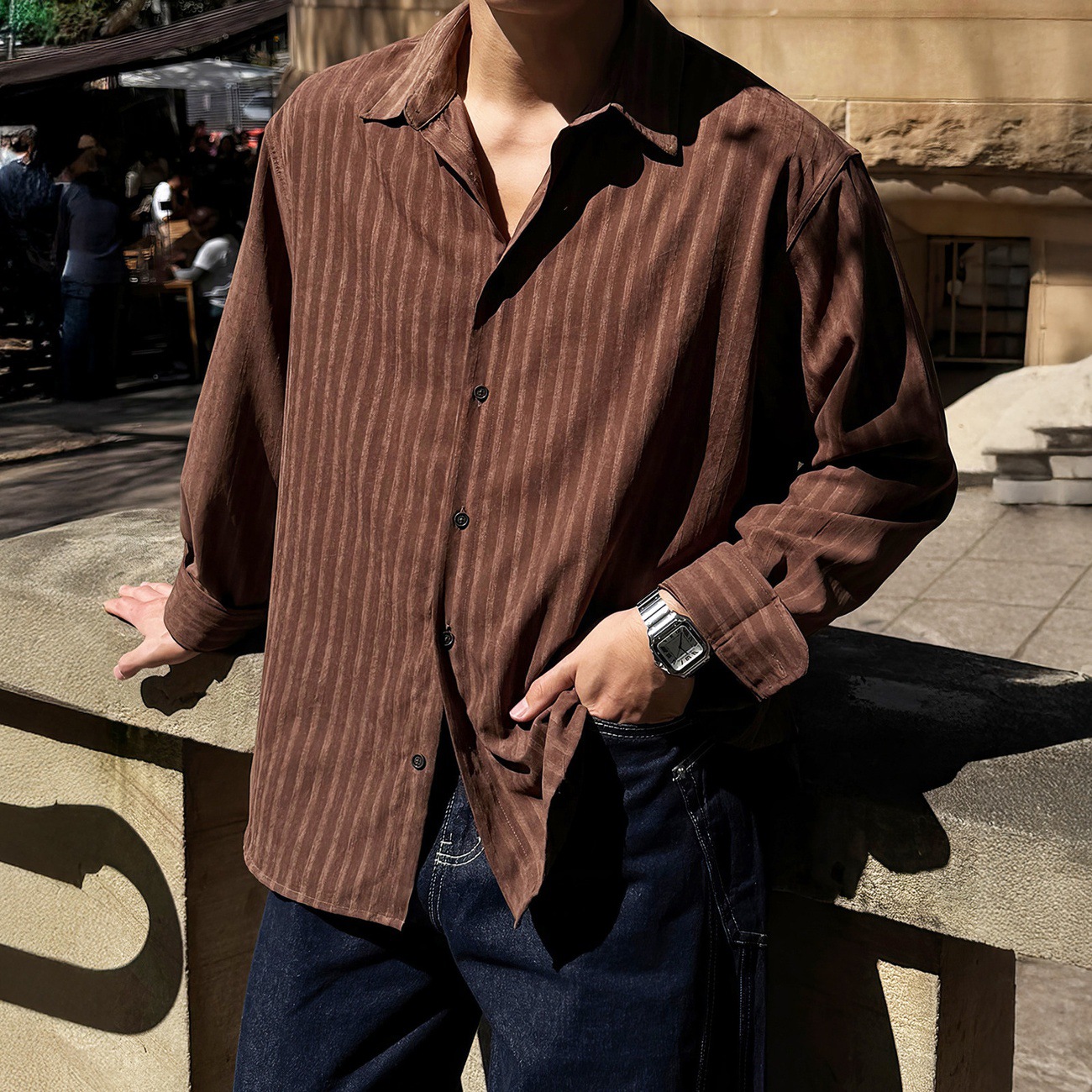 棕色竖条纹翻领长袖衬衫男款春秋韩系简约高级感商务通勤百搭衬衣