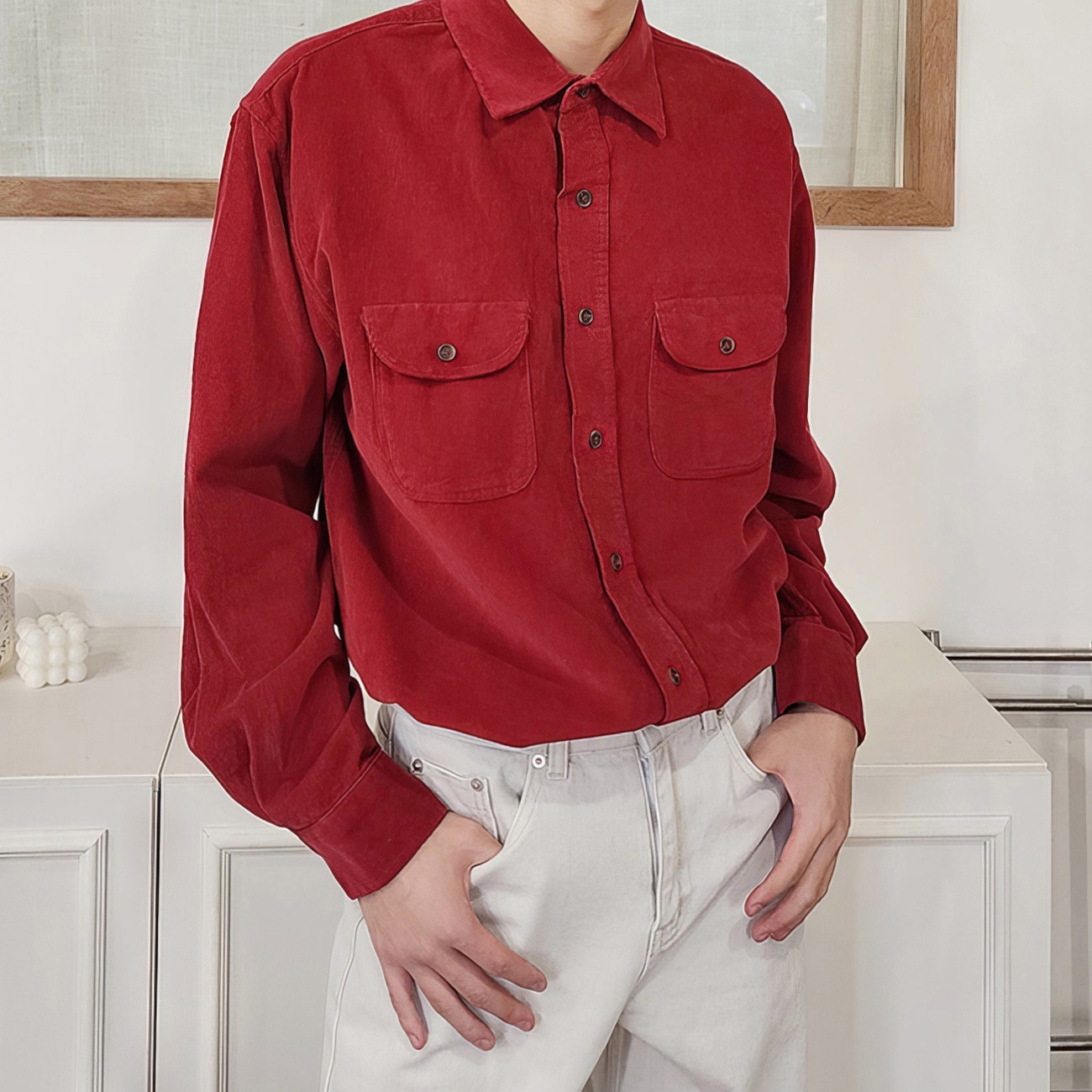 复古酒红色灯芯绒长袖衬衫男春秋港风新年喜庆翻盖双口袋衬衣外套