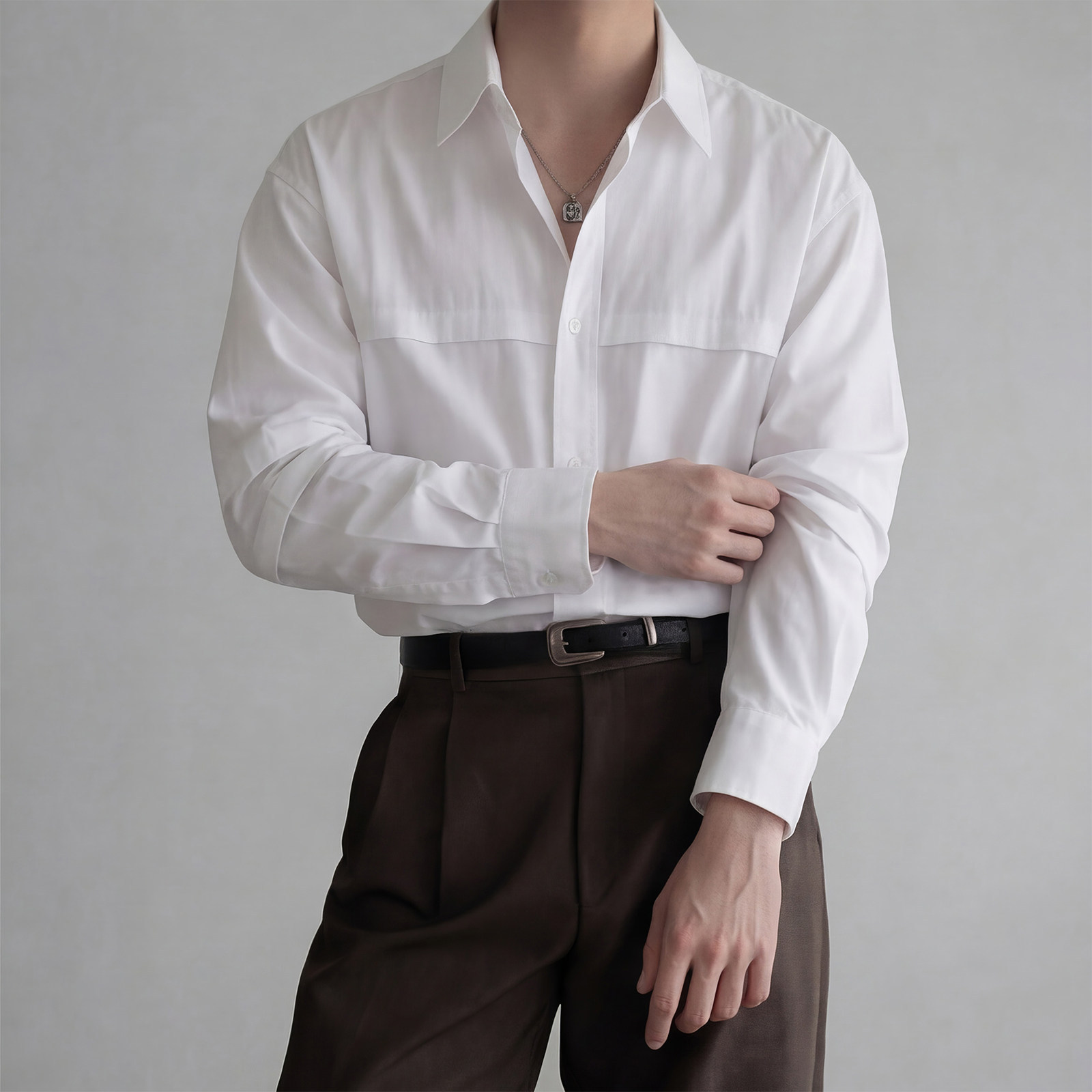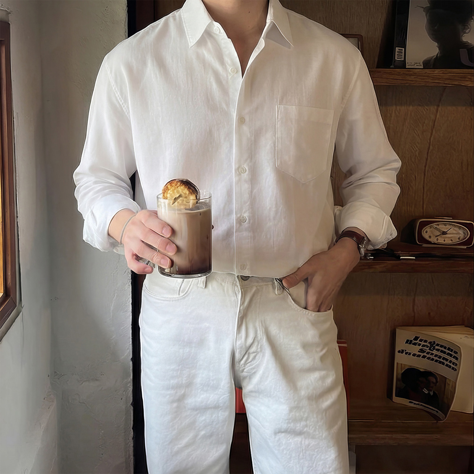 白色透气长袖衬衫男士春秋季老钱风复古雅痞cleanfit内搭衬衣外套