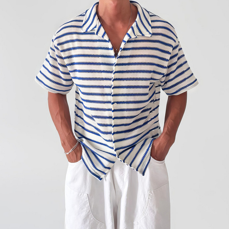 蓝色条纹短袖衬衫男夏季韩系设计感时尚针织免烫衬衣通勤休闲上衣