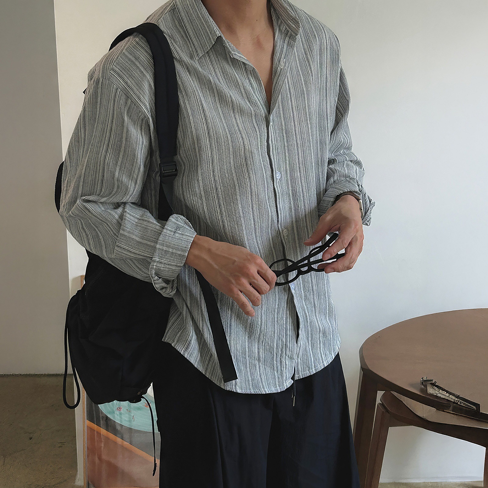 美式工装风翻领长袖衬衫男款春秋季竖条纹肌理感抗皱免烫衬衣