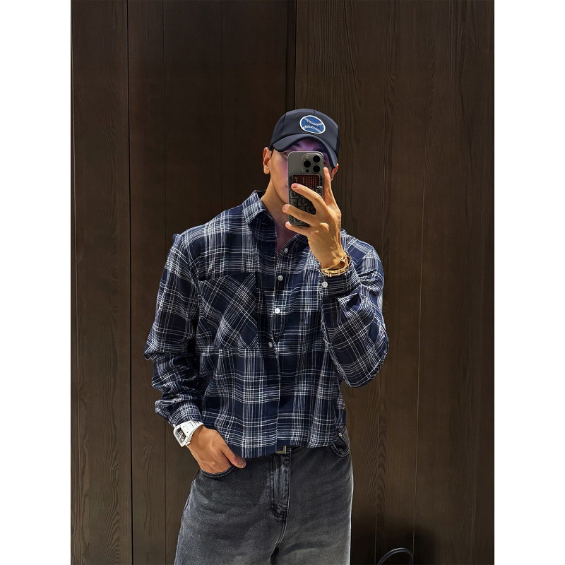 美式复古蓝色水洗做旧牛仔长袖衬衫男春季宽松双口袋工装衬衣外套