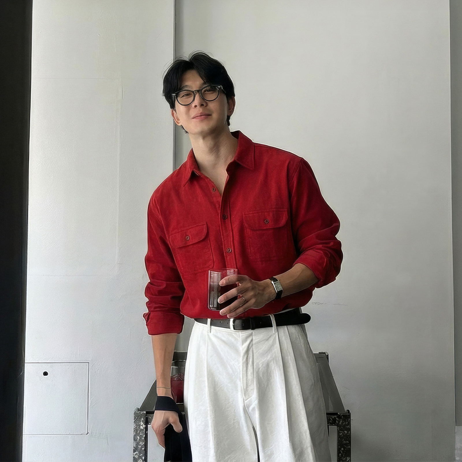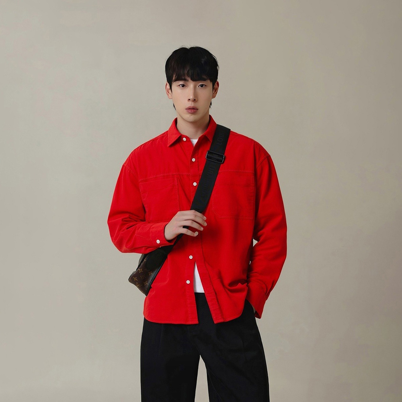 新年红色喜庆穿搭绒感灯芯绒长袖衬衫男款春秋季百搭订婚衬衫外套