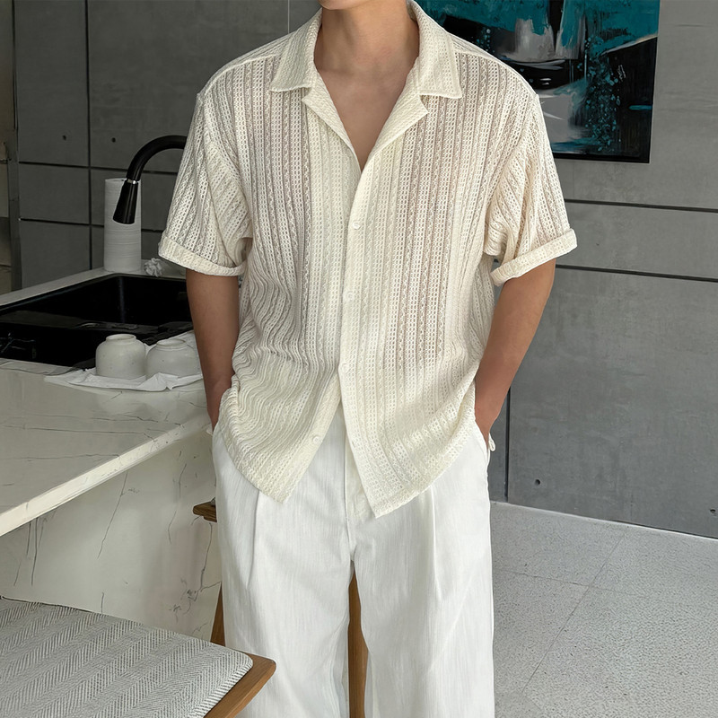 镂空古巴领短袖衬衫男生夏季宽松休闲半袖翻领衬衣高级感抗皱上衣