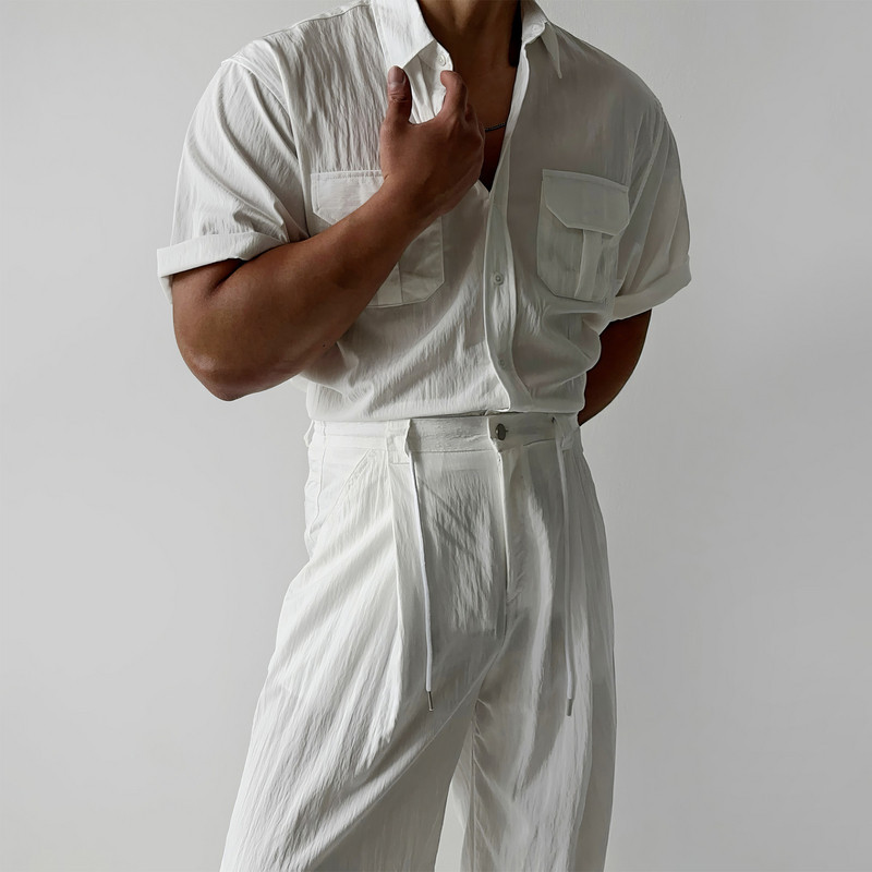 白色翻领短袖衬衫套装男夏季韩版时尚百搭直筒裤宽松垂感阔腿裤子