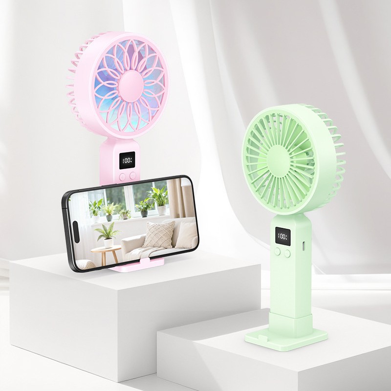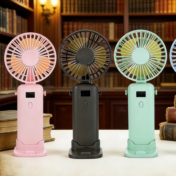 26年外贸数显锂电手持折叠风扇带底座支架桌面小风扇挂脖风扇五档