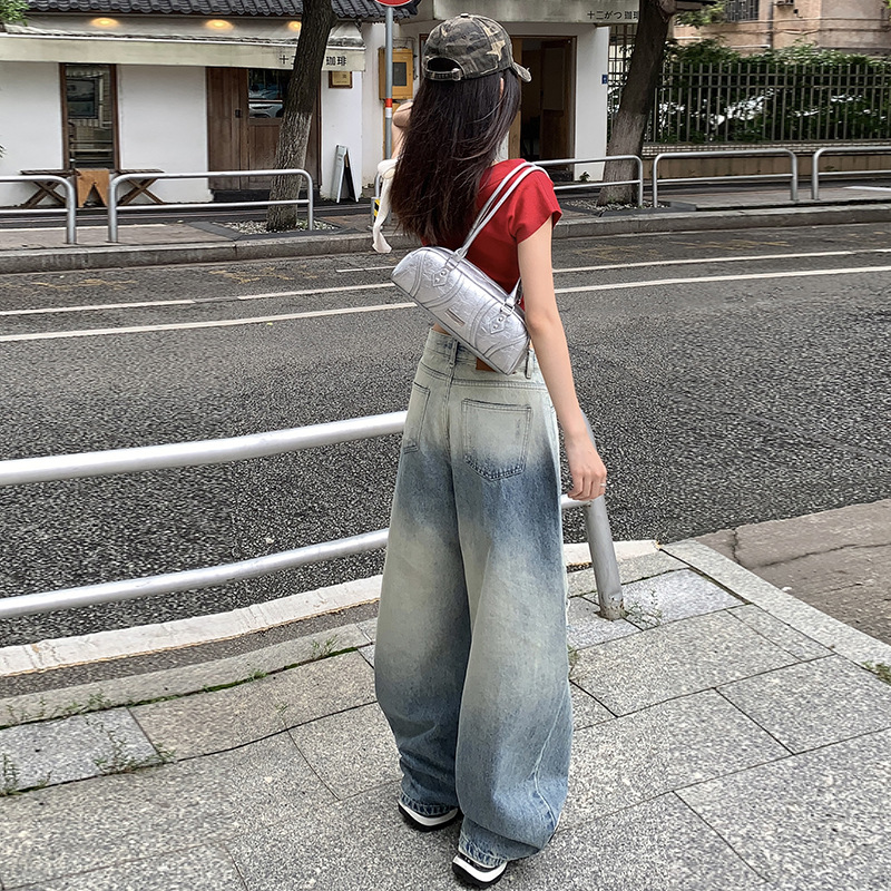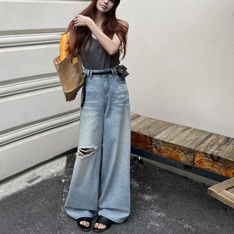 美式复古重工中性阔腿拖地裤2025夏季新款破洞直筒牛仔裤女子女潮