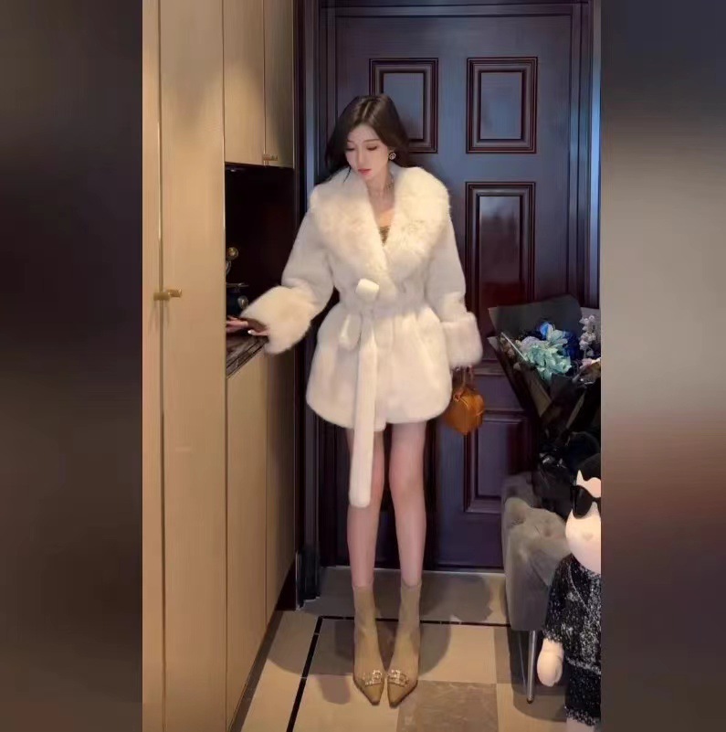 冰岛月光冬季貂绒皮毛一体仿皮草大衣加厚外套含腰带显瘦毛毛大衣
