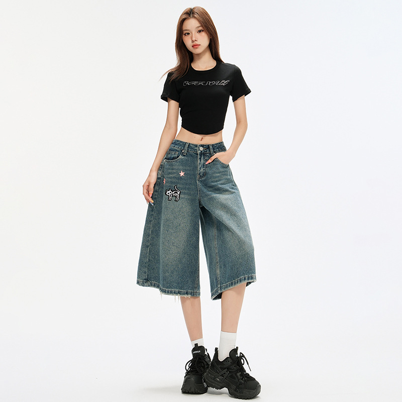 阔腿七分牛仔裤女2025夏季设计感小猫五角星贴布刺绣直筒宽松中裤