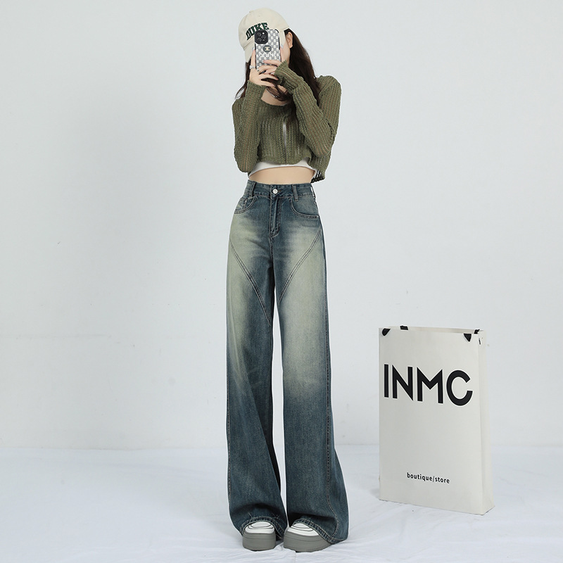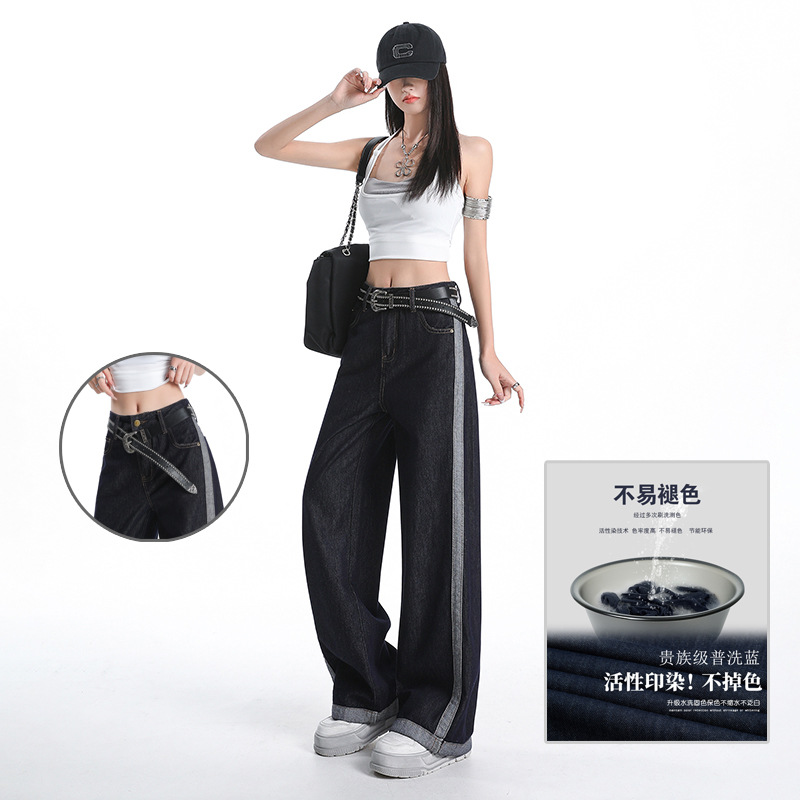 高质感丹宁拼接高腰阔腿牛仔裤女2025春秋宽松显瘦拖地裤潮