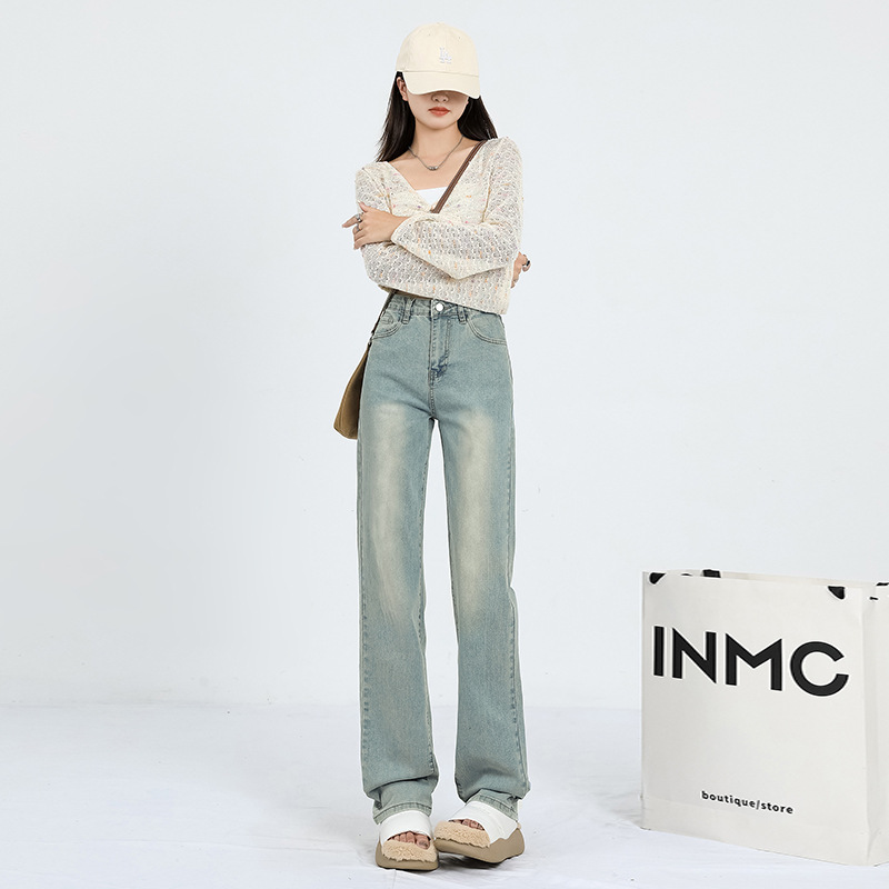 水洗复古蓝直筒高腰牛仔裤女2025百搭经典小众港风纹理磨白阔腿裤