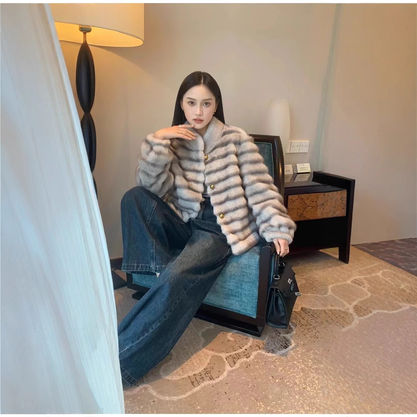 2025新款新中式盘扣海宁皮毛一体短款立领皮草大衣仿水貂绒外套女