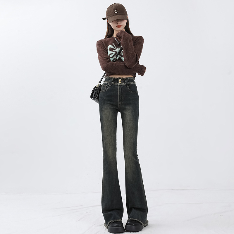 水泥灰微喇毛边牛仔裤女2025新款高腰显瘦弹力垂坠感拖地喇叭裤