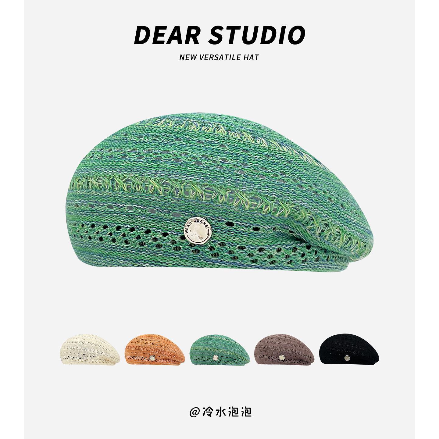 日系复古镂空针织贝雷帽子女夏季清新苔痕绿显脸小画家帽蓓蕾帽潮