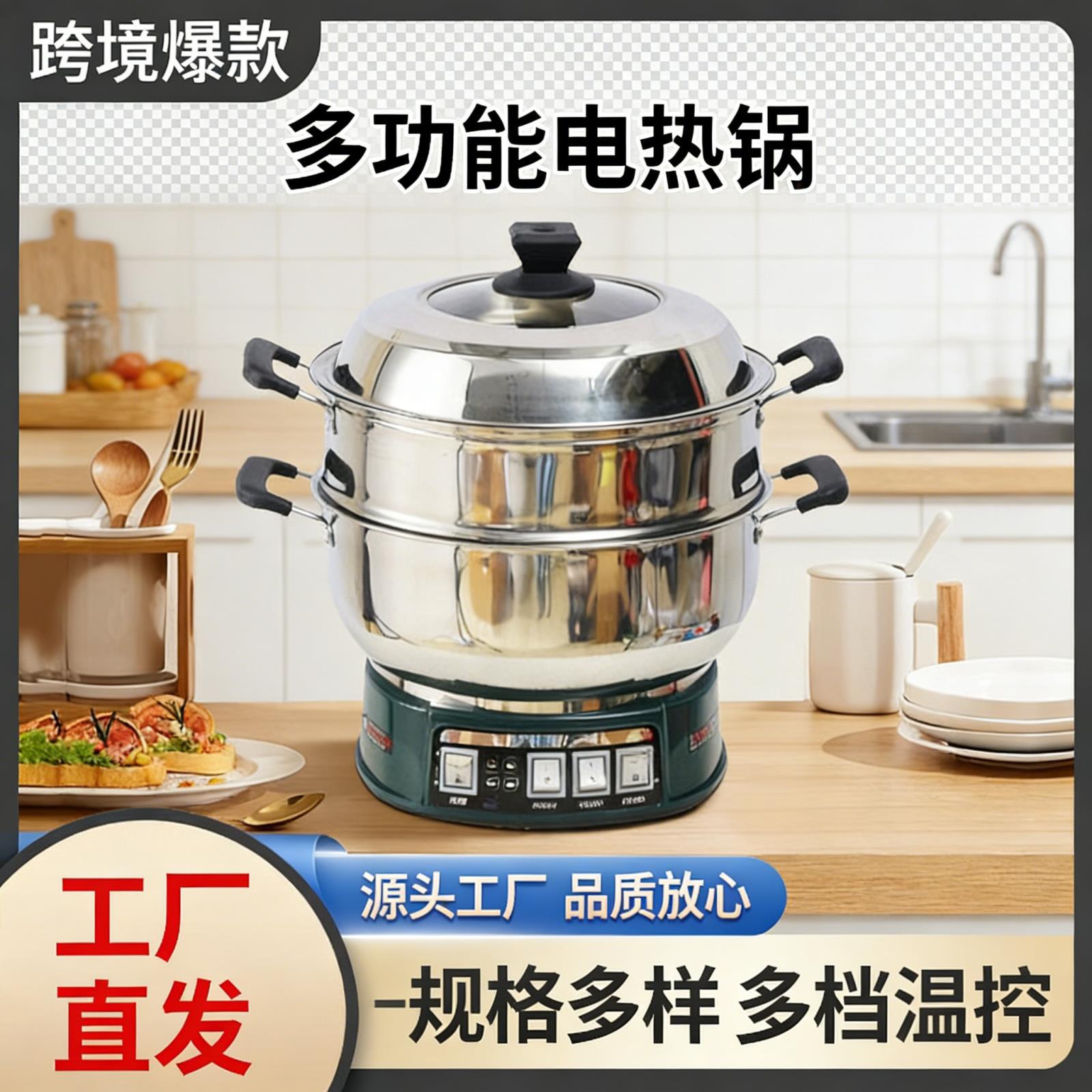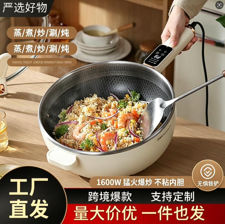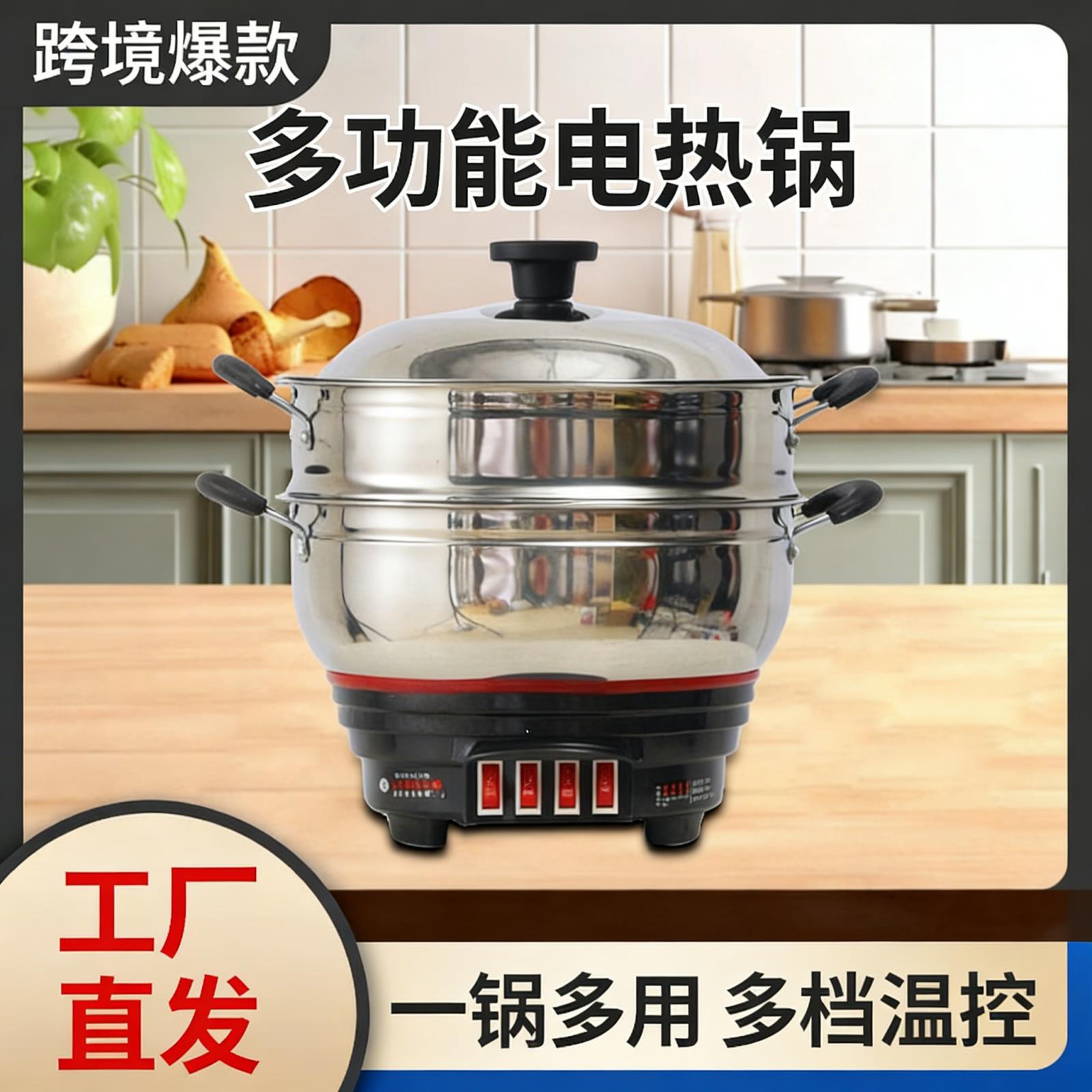 跨境不锈钢电热锅多功能家用炒菜电炒锅火锅蒸煮炖一体插电大功率