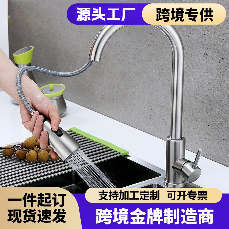 跨境家用不锈钢拉丝黑色厨房水龙头洗菜盆水槽冷热延伸抽拉式龙头