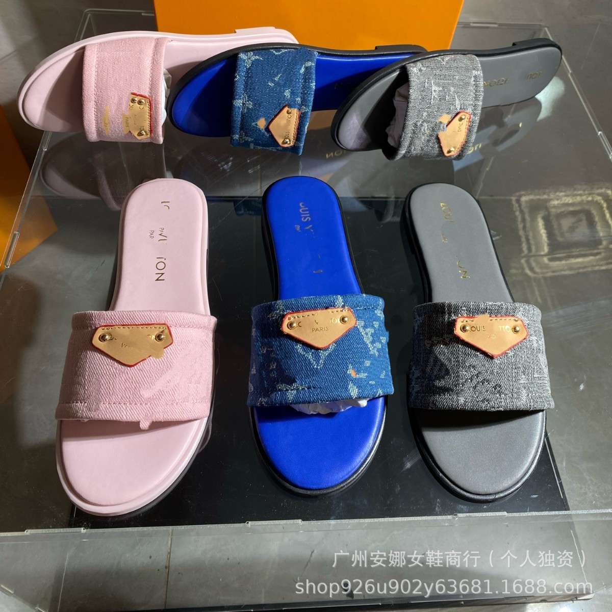 2025驴家新款平底拖鞋女牛仔布时尚纯色外穿印花沙滩一字带拖鞋