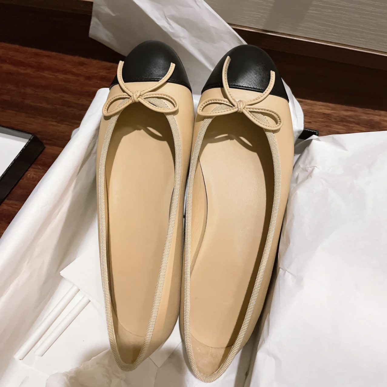 羊皮版~真皮蝴蝶结圆头浅口鞋女小香经典拼色平底玛丽珍鞋瓢鞋