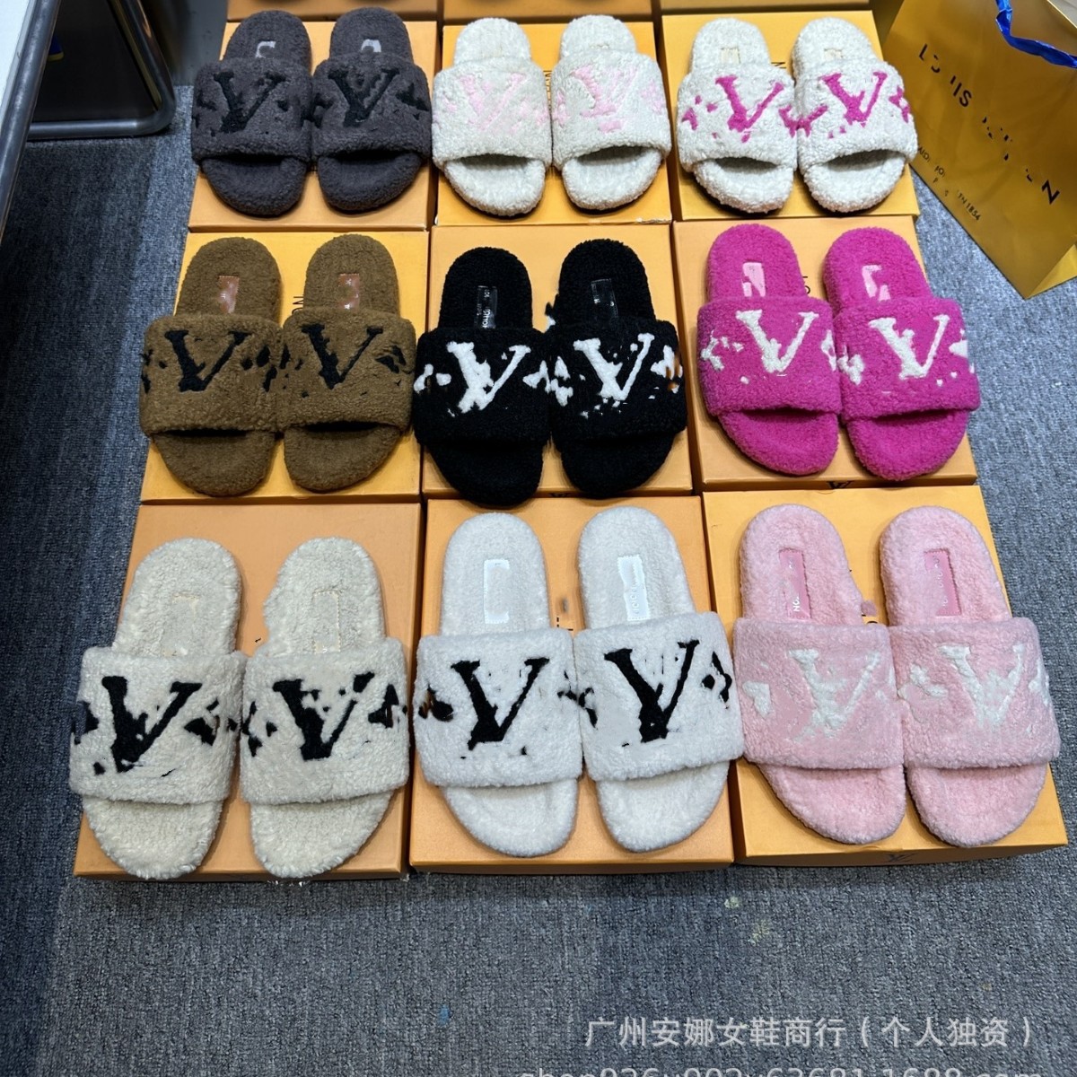 H家网红休闲糖果色羊羔毛毛鞋泰迪毛羊毛H拖鞋女外穿平底一字拖鞋