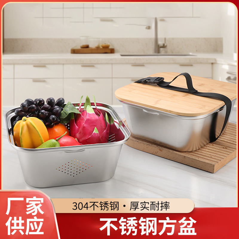 厂家货源304不锈钢日式保鲜盒带竹盖储存收纳长方形密封木盖饭盒