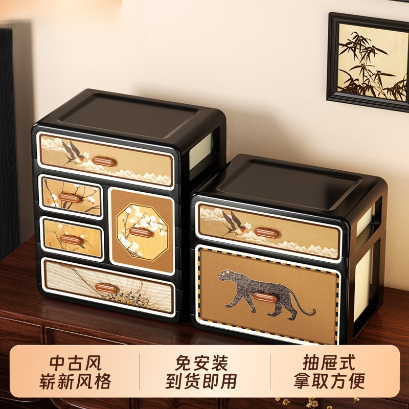 抽屉式桌面收纳盒家用多层中古风化妆品大容量文具整理防尘收纳箱