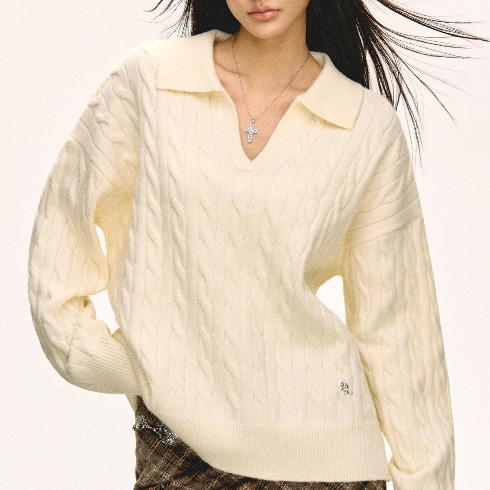跨境亚马逊新款翻领毛衣外套女Polo领秋季绞花休闲宽松厚款针织衫