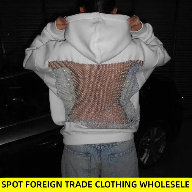 欧美跨境秋冬新款女装亚马逊时尚纯色镂空网纱连帽衫露背卫衣女秋