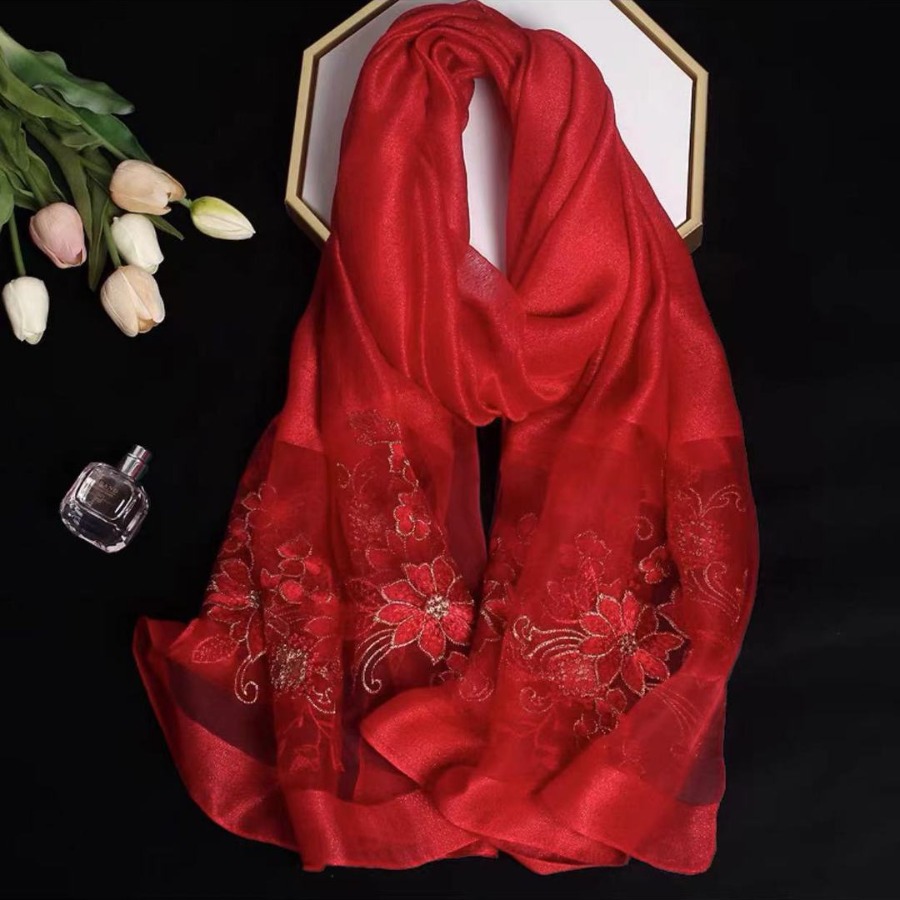透气简约红色披肩妈妈真丝丝巾女旗袍新年本命年礼物秋冬季