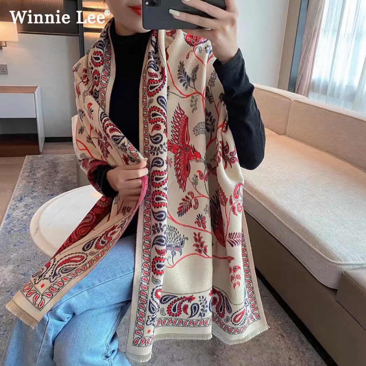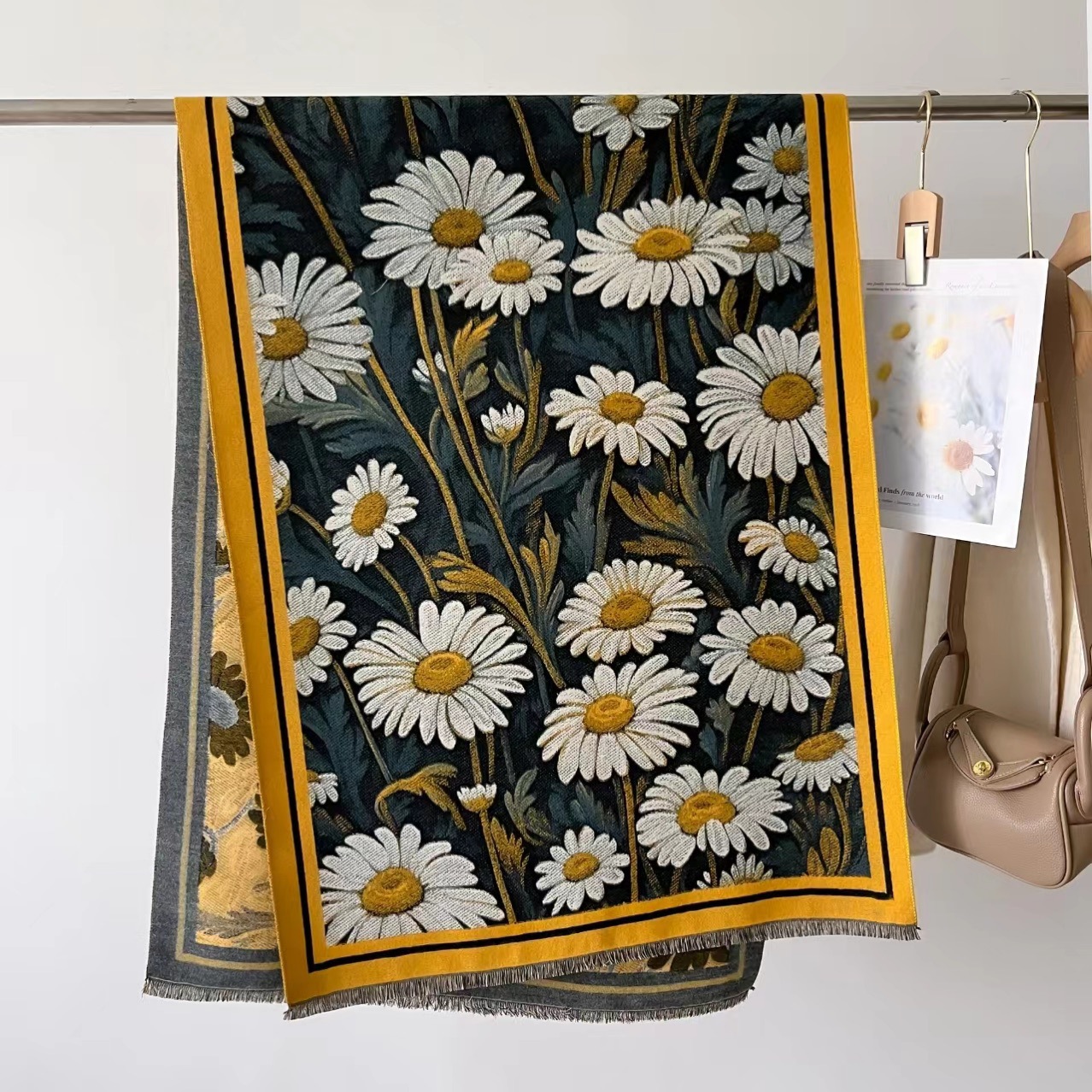 2024年太阳花秋冬新款仿羊绒围巾保暖百搭披肩两用清新复古印花女